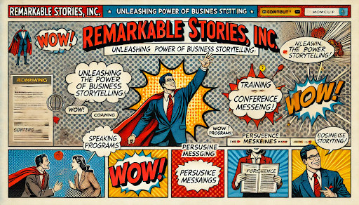 CHatGPT Prompt: Create a mockup image of a comic-book themed website for the Remarkable Stories, inc. business communication consultancy. Use Silver Age Marvel comics as a reference. The business offers coaching, training, and speaking programs that help organizations deliver presentations and pitches, craft persuasive messaging, and map out their brand stories. Conference keynotes on business storytelling are also offered.